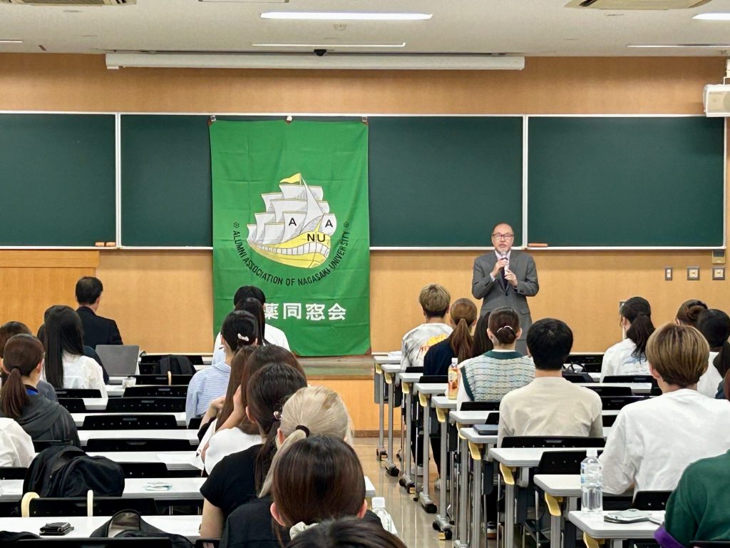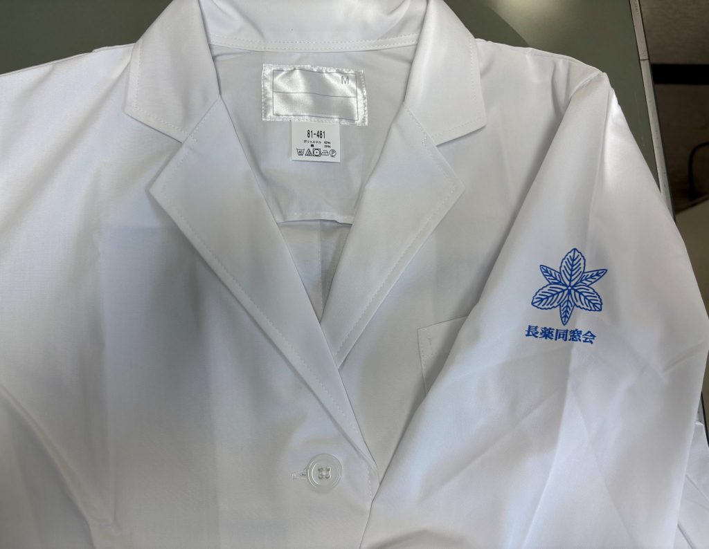 令和7年10月2日(木)、薬学部多目的ホールにて、薬学部1年生全員に同窓会のロゴが入った白衣を贈呈しました。この贈呈式は2014年に始まり、今年で12回目を迎えます。今年の式には、中嶋幹郎同窓会長と川上 茂副会長が出席されました。