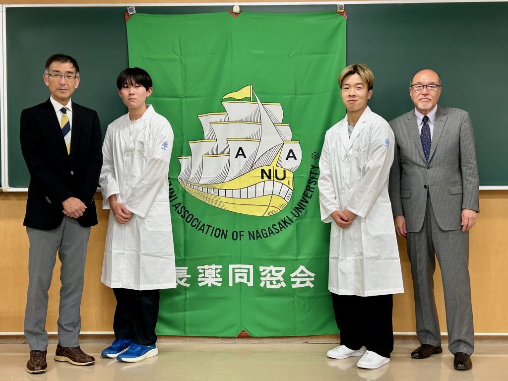 贈呈式では西田学部長、および中嶋同窓会長から激励の言葉を頂戴しました。その後、薬学科・薬科学科の各代表者1名に、長崎大学薬学部の象徴である柏葉のロゴマークが入った白衣が授与されました。今年のロゴは青色です。同窓会一同、この白衣を着て目標に向かって進まれる1年生の皆さんの今後のご活躍を、心より楽しみにしております。