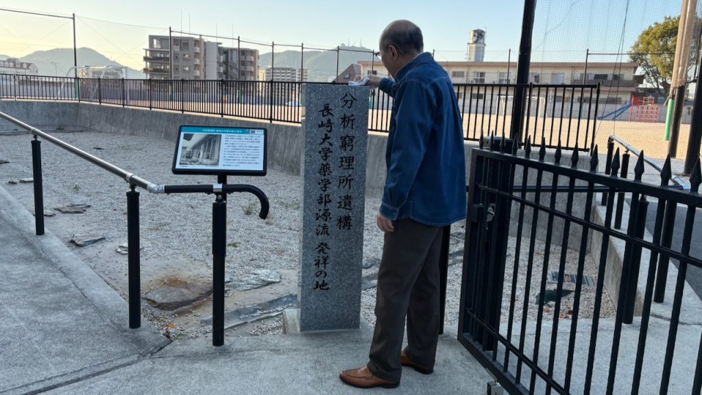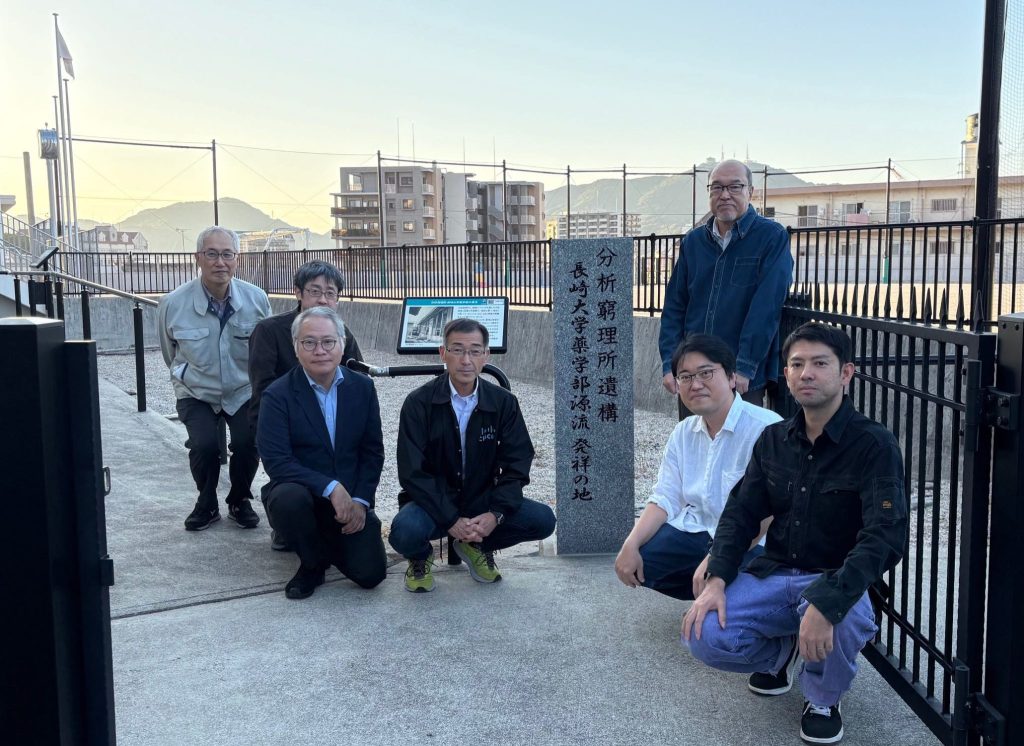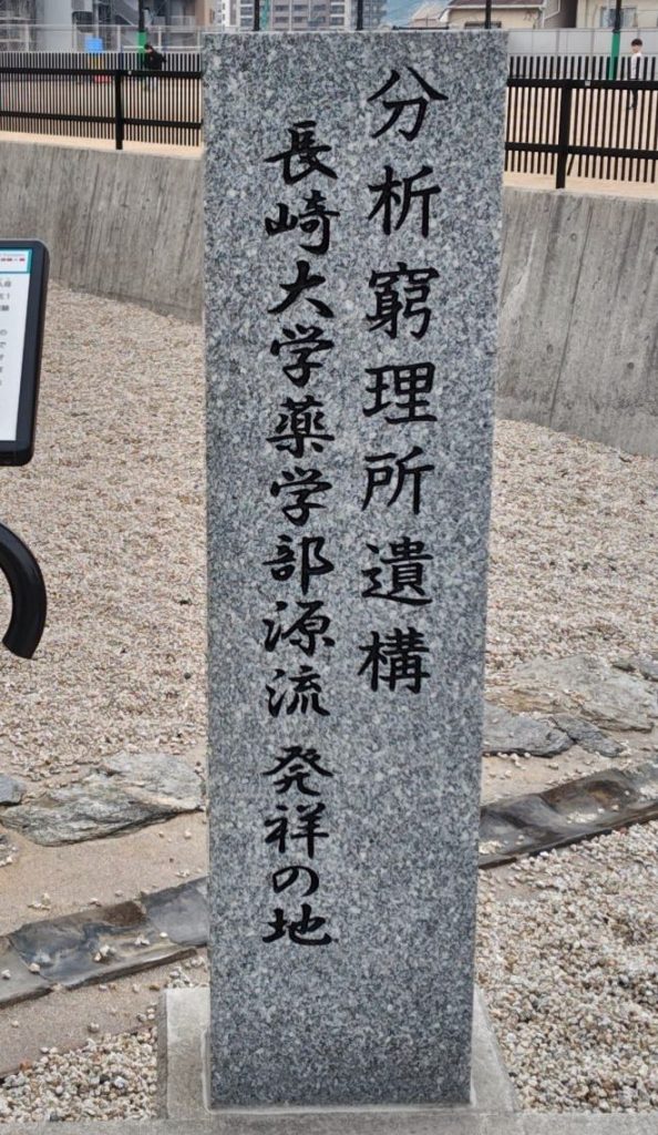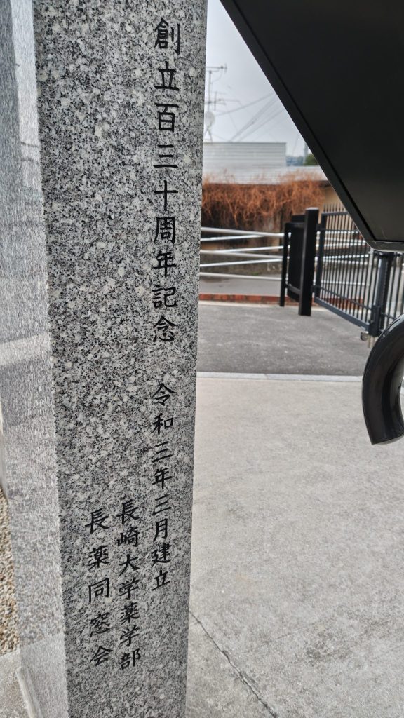 2020年度の事業として、2021年(令和3年)3月に第五高等中学校医学部に薬学科が創設されてから130周年(分析窮理所から数えて155周年)を記念し、長薬同窓会と長崎大学薬学部の両者で記念碑を建立しました。周辺には長崎大学薬学部の源流である分析窮理所に関する説明板や年表が多数設置されています。