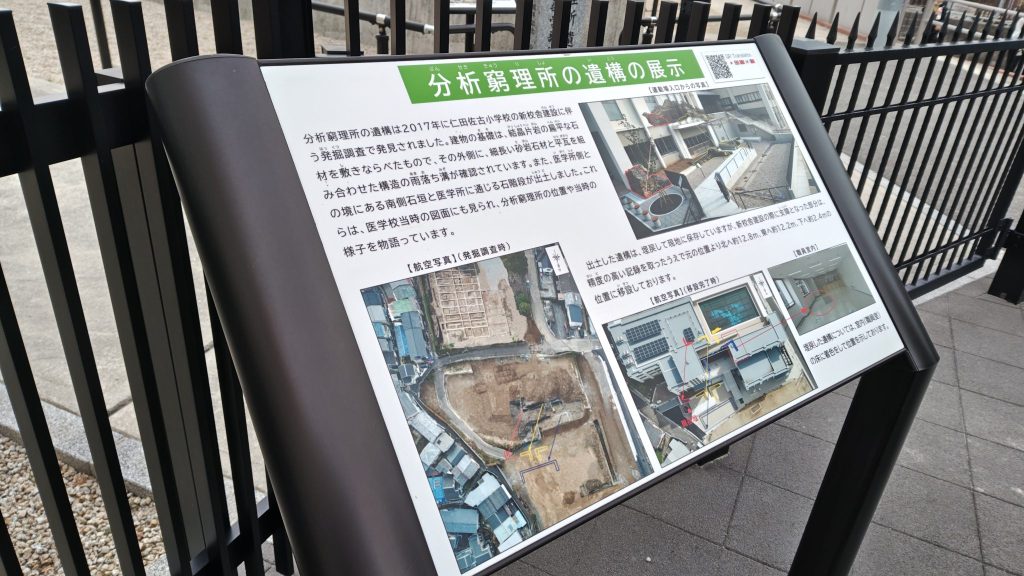 資料館には長崎小島養生所の基礎部分の一部がそのままの形で保存されているほか、分析窮理所で使用されていたであろうガラス器具なども展示されております。お近くにお越しの際はぜひお立ち寄りください。